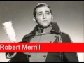 Robert Merrill (June 4, 1917 -- October 23, 2004) was an American operatic baritone, who was also active in the musical theatre circuit. He received the National Medal of Arts in 1993. Merrill's 1944 operatic debut was in Verdi's Aida at Newark, New Jersey, with the famous tenor Giovanni Martinelli, then in the later stages of his long operatic career. Merrill, who had continued his vocal studies under Samuel Margolis made his debut at the Metropolitan Opera as winner of the Metropolitan Opera Auditions of the Air in 1945, as Germont in La traviata. Also in 1945, Robert Merrill recorded a 78rpm record set with Jeanette MacDonald featuring selections from the operetta Up In Central Park; MacDonald and Merrill did two duets together on this album. In 1951, Merrill did a series of duet recordings together with the Swedish tenor Jussi Björling, including the world-renowned recording of "Au fond du temple saint" from the opera Les pêcheurs de perles by Georges Bizet. Again in 1952 Merrill and Björling, as well as Victoria de los Ángeles made a widely admired recording of Puccini's La bohème, conducted by Sir Thomas Beecham. In 1953, Merrill, Björling, de los Angeles and Zinka Milanov recorded the complete Pagliacci and Cavalleria rusticana...